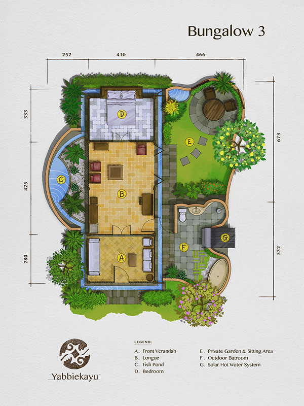 Bungalow 3 offers a slightly more spacious interior than Bungalow 1 and 2, featuring a separate, closable bed nook and a beautifully cool marble floor. Designed with an open and airy layout, this bungalow allows natural breezes to flow from the private outdoor living space on the south side, through the living area, and out toward the serene water feature and fishpond to the north.